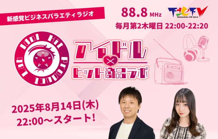 ヒット商品ブートキャンプは、下北沢のタウンFMラジオ曲「下北FM 88.8」で、新感覚ビジネスバラエティラジオ『アイドル×ヒット商品ラボ』をスタートします。記念すべき第一回オンエアは、2025年8月14日(木)22:00〜です。